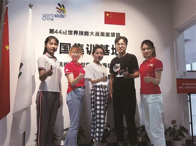 | 2019年9月 在位于杭州的世界技能大赛美发项目中国集训基地,本报记者杜成敏(右二)采访第45届世界技能大赛美发项目冠军石丹(右一)后,和该项目的中国队队员合影。 |