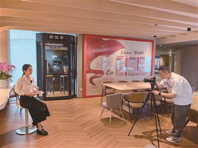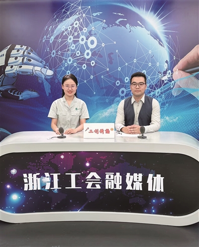 | 2024年9月30日 本报记者李凡(右)与首届全国“红旗杯”班组长大赛电力赛道第一名获得者、国网杭州市萧山区供电公司谢超在录制《工创新语》访谈节目。 |