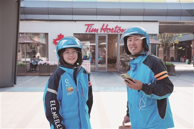 | 2024年记者节前夕 本报见习记者贾馨然(左)体验外卖小哥的工作与生活。 |