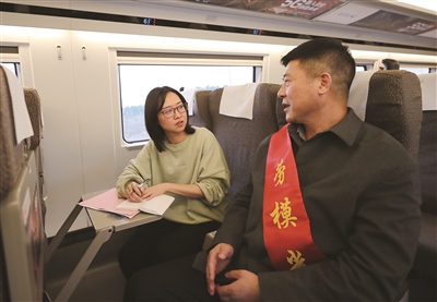 | 2020年11月 全国劳动模范和先进工作者表彰大会在北京举行,随团记者曾晨路(左)在列车上采访全国劳模、中国铁路上海局集团有限公司杭州电务段信号工、高级技师冯明。 |