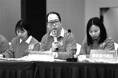 这是日前湖州市第四届劳动关系协调员技能比武暨首届工资集体协商技能竞赛的一幕。本次比赛由湖州市总工会联合多家单位在德清举办。经过前期的层层选拔,来自全市的6支代表队、32名队员参加最终对决。本次竞赛内容由案例评选、知识竞答及模拟协商三部分组成。其中模拟协商部分要求各参赛队根据给定案例,按抽签分别扮演职工方和企业方,围绕学历提升、技能工资、创新激励等与职工权益密切相关的能级工资议题开展现场模拟协商。