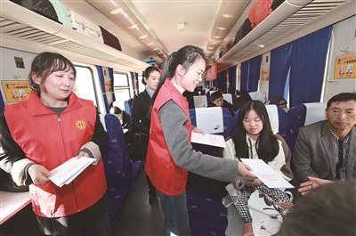 图为诸暨市工会志愿者在列车上发放《决定》读本。