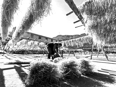 经过冷却,豆面逐渐失去了多余的水分,变得更加坚韧和有弹性。三门人将豆面一簇簇轻轻分开,搭在竹竿上,阳光透过竹竿洒下,暖暖地照在豆面上,慢慢将它们晒干。