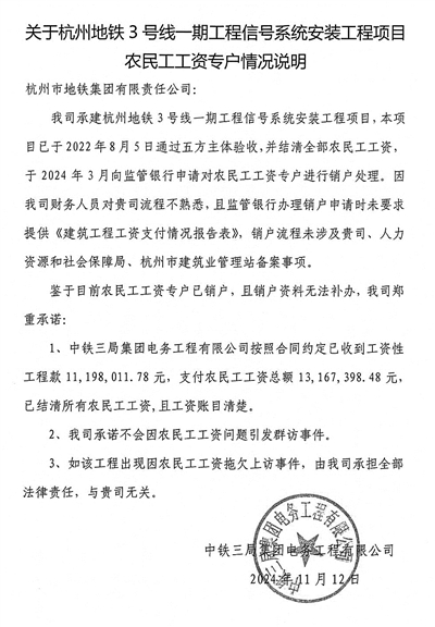 根据《浙江省人力资源和社会保障厅等11部门关于印发〈浙江省工程建设领域农民工工资专用账户管理实施细则〉的通知》(浙人社发【2022】14号),现对中铁三局集团电务工程有限公司承建的杭州地铁3号线一期工程信号系统安装工程项目农民工工资专户情况说明进行公示,本项目已于2022年8月5日通过五方主体验收,建筑工人工资均足额发放。如发现存在拖欠农民工工资行为,请及时携带有关证据材料到杭州市劳动保障服务中心举报投诉。如无举报和投诉,将视为不存在拖欠和克扣农民工工资问题。举报投诉电话: