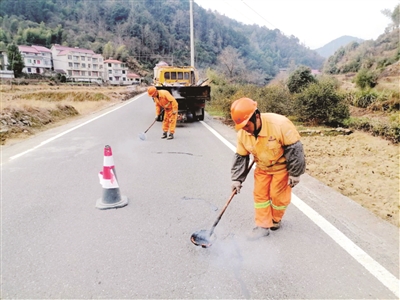 12月24日,开化县苏界线,开化县公路港航与运输管理中心的养护人员正忙着对受损的沥青路面进行灌缝保养。