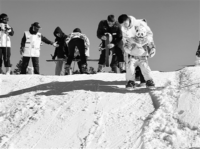| 宁波奉化溪口商量岗景区滑雪场,小学员在工作人员的指导下滑雪。 通讯员应秀一 摄 |