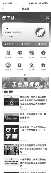 记者寿慧桢报道 “想旅游,景区门票优惠券抢起来;想买特产,对口帮扶礼包选起来;想看电影,折扣影院任意挑;想健身,专业场馆免费预约……工会的服务真香!”日前,浙江新绿传媒科技有限公司职工王超向记者展示了2024年以来在“爱安吉”APP中的“云工益”数智工会综合服务系统(以下称“‘云工益’应用平台”)上抢兑到的各类优惠券。