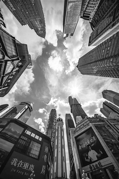 | 陈潜用超广角镜头捕捉到的重庆解放碑。 |