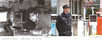 (左)技术考核,牛刨工吕达伦——(右)现为保安公司保安,守护一方平安。