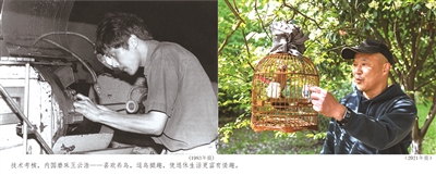 (左)技术考核,内圆磨床工王云浩——(右)现在喜欢养鸟,逗鸟撷趣,使退休生活更富有情趣。