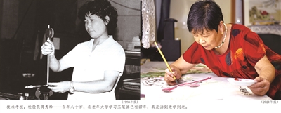 (左)技术考核,检验员蒋秀珍——(右)现在老年大学学习工笔画,真是活到老学到老。
