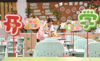 2月11日,华东师范大学附属仙居学校,老师在布置教室。开学在即,仙居县各学校教职工提前到校,做好各项准备工作,迎接新学期。