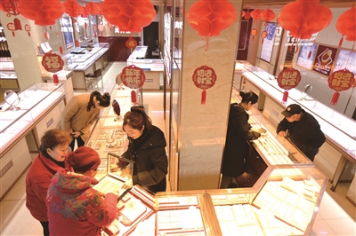 2月11日,顾客在湖州市德清县乾元镇一家金店挑选黄金首饰。2月10日,国际现货黄金价格突破2900美元/盎司大关,续刷历史新高,年内涨幅超250美元/盎司;COMEX黄金期货价格触及2927美元/盎司,同样创下新高。2月11日,亚市早盘,现货黄金曾触及2921.52美元/盎司,再度创下历史新高。