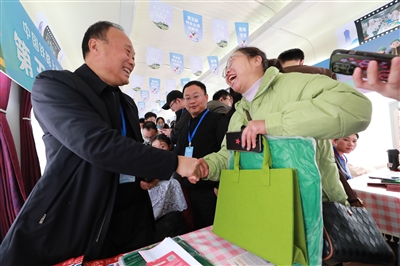 | 来自江西鹰潭市的胡大姐(右)与德清钟管镇一家企业洽谈好后高兴地说:“这趟车坐得值了!” |