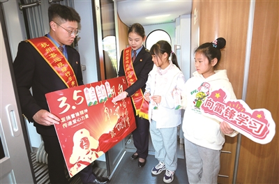活动中,乘务组将精神传承转化为暖心服务:站台上,大手牵小手护送孩子安全乘车;车厢内,无微不至关注银发旅客的各类需求……乘务员们的一言一行,将雷锋精神的种子播撒到每一名乘客的心里。同时,他们还特别设计了雷锋主题流苏书签,通过趣味问答送给青少年旅客,让红色基因在寓教于乐中赓续传承。