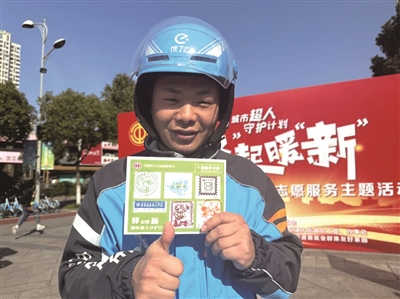 | 外卖小哥正在活动现场进行志愿服务盖章打卡。 |