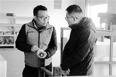 | 劳模工匠助企行服务队成员(左)与企业职工探讨技术难题。 |