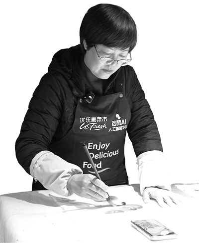 早上9点多,宁波江北洪塘街道优乐惠菜场喧嚣声已逐渐散去,在一个海鲜干货摊位上,53岁的摊主张莺躬着背,一只手稳稳地撑在干货摊上,一只手紧握着蘸满墨汁的毛笔,眼神专注,正在临摹一幅花鸟画。