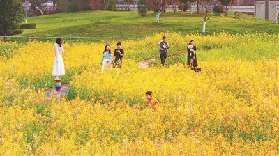 近日,丽水市区好溪路旁的七彩油菜花竞相绽放,金黄、粉红、雪白等各色花朵争奇斗艳,宛如一幅绚丽的油画,吸引众多市民游客前来打卡拍照,感受春天的气息。
