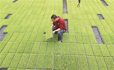 日前,在湖州市德清县洛舍镇东衡村先丰农业智能育秧工厂内,工人在观察早稻秧苗长势。