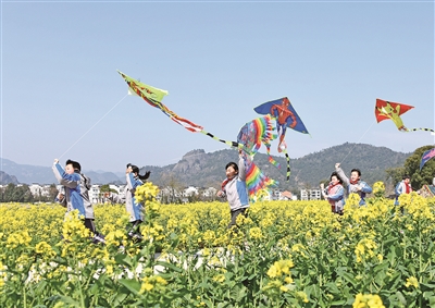 3月20日,台州市仙居县双庙乡油菜花竞相绽放,一群小学生在花田间放风筝,尽情享受春光。近年来,双庙乡通过“党建+农旅融合+观光休闲”模式,积极发展乡村休闲生态旅游,促进当地农民增收,助力乡村振兴。