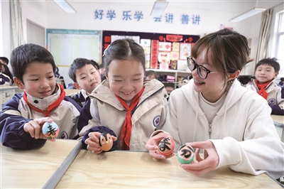 3月20日,杭州市桐庐县迎春小学,学生在玩春分立蛋游戏。当天,桐庐县迎春小学开展了“春分绘彩蛋”课间主题活动,学生们绘彩蛋、玩立蛋,感受春分节气的传统文化。