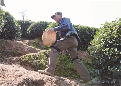 | 邵国宝穿着髋部助行外骨骼行走在茶园。 见习记者任杰 摄 |
