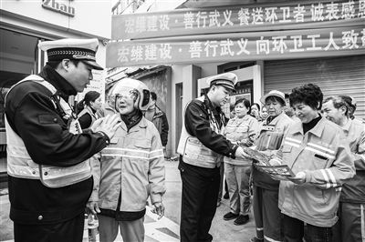 近日,武义县公安局交警大队精心组织了一场别开生面的为环卫工人送平安活动。民警们针对环卫工人日常工作的特殊性,开展了极具针对性的平安出行知识宣传。民警们通过生动案例分析、现场演示等方式,向环卫工人详细讲解了交通安全法规,耐心细致地指导环卫工人如何正确佩戴安全头盔等。
