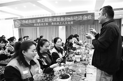 | 阳光课堂上,职工们沉浸在插花的乐趣中。 |