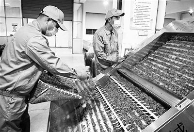图为浙江乡雨茶业有限公司的生产车间内,工人开足马力加工针型茶。