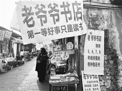在绍兴古城的书圣故里西街96号,有一家别具一格的书店。这家书店面积仅30平方米,四四方方的,一位慈眉善目的老爷爷守在这片书香之地。书店的门头低矮,侧面红底白字的招牌上,“老爷爷书店 第一等好事只是读书”几个大字赫然在目。门前经常围绕着慕名前来的年轻游客们,他们或驻足拍照,或进店翻阅——在一些社交平台上,“老爷爷书店”已经成为年轻人来绍兴必打卡的网红店之一。不过,因为租约到期,明年,开了快30年的书店可能要“打烊”了。