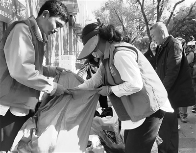 | 活动现场,工会志愿者认真整理旧衣物。 |