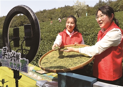 近日,在湖州市吴兴区道场乡施家桥村琴忻谷茶场,吴兴区供销合作社组织“吴上兴鲜”直播团队开展春茶直播活动,向网友介绍茶叶采制过程,助力茶农销售。茶叶产业是当地村民主要收入来源。春茶开采后,吴兴区各乡镇、街道组织各类志愿服务队线上线下一起发力,拓宽茶叶销售渠道,助力茶农增收。