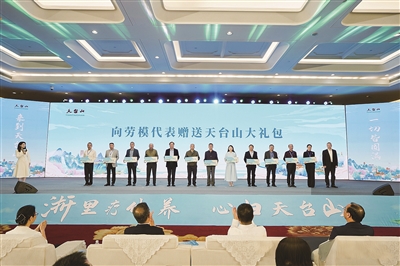 启动仪式上,12位劳模代表现场领到了专属文旅大礼包。31位来自省内各地的劳模将在启动仪式后,就地在天台开展疗休养活动。