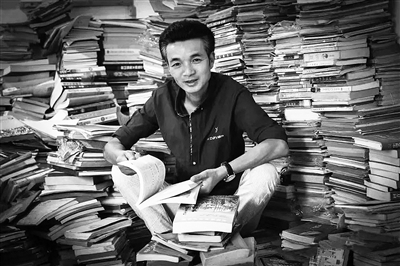 | 周文海在由旧书堆砌而成的“书山”中。 |
