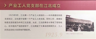 江北区是宁波工人运动的发源地。1924年秋至1925年春,江北先后创办了宁波首所工人夜校、宁波第一个产业工会和产业工人党支部。