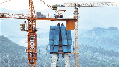 图为工人在铁路桥主塔顶部进行混凝土浇筑作业。