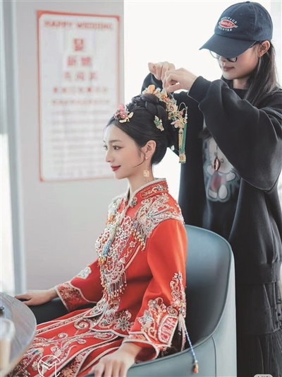 | 图为米雪为新娘设计秀禾妆造。 |