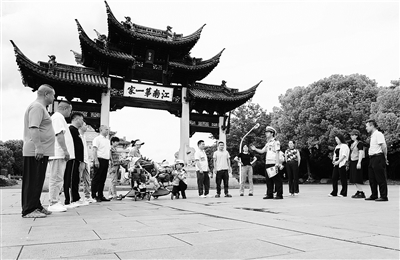 图为近日,浦江县公安局交警大队民警辅警在“江南第一家”景区向游客们普及交通安全知识,讲解景区道路安全出行注意事项。