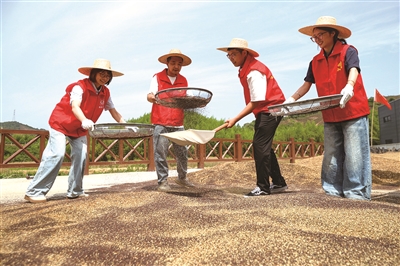 5月19日,在湖州市吴兴区埭溪镇贯边村,党员志愿者在帮助种植户手工筛油菜籽。眼下,正值油菜成熟的时节,埭溪镇组织镇村党员志愿者深入田间地头开展志愿服务活动,帮助种植户收割油菜。通讯员何伟卫 摄