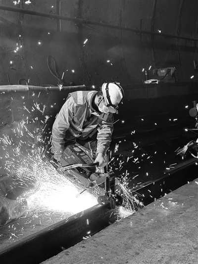“今天施工更换钢轨长度为18.35米,在切割作业时误差区间必须控制在1毫米内。”说话间,火花瀑布般从游奕杰手间“倾泻”,将隧道映照成白昼。不到两分钟,旧钢轨端头应声而断。看起来冰冷坚硬的钢轨,在他手上变得十分“听话”,他和同事合力将钢轨平移到轨枕上。随着接头处的焊火点燃,钢轨温度飙升至1000℃以上。“盛夏时节才是真正的‘烤’验,除了热还会呼吸困难。”游奕杰调整着防护面罩说道,隧道内不通风就像蒸锅,作业的热浪会让空气急速升温。3分钟后,新旧轨头融为一体,焊轨完成。经过强热炙烤的轨头还没有完全冷却,打磨等机器依次上阵……