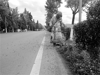 5月20日,开化县公路港航与运输管理中心的养护人员头戴面罩、肩扛打草机,在城白线14K+500路段开展打草作业,清除两侧路肩杂草,提升路况路貌,进一步巩固全国文明城市创建成果。