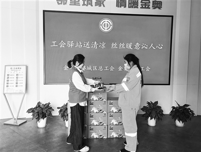 一丝清凉,万分牵挂。连日来,金华市婺城区总工会工作人员先后走进金奥社区工会驿站、万诚社区工会驿站等多家工会驿站,将一箱箱消暑饮品送到环卫工人、快递小哥、外卖骑手等户外劳动者手中。