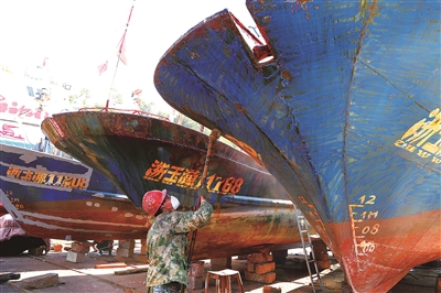 日前,东海进入伏季休渔期。在玉环市坎门街道灯塔船舶修造厂,一名修船工正为渔船除锈。通讯员吴达夫 摄