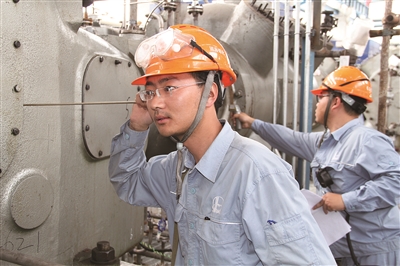 日前,中国石化镇海炼化分公司机动部动设备专业团队副主任周伟,用听棒监测设备运行情况。