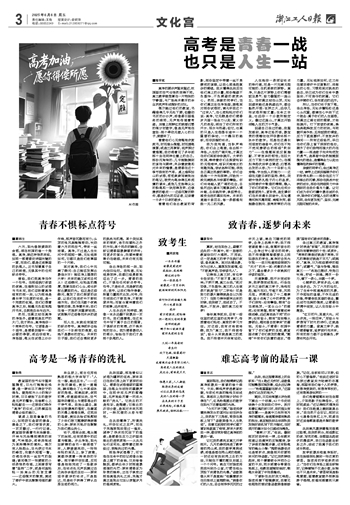 每年高考前后,总有一些往届的或应届的优秀学子,传授着他们轻松、高效的学习方法。对这些,我有点将信将疑,因为“高三,我不相信传说”,奋斗从来就是高三的底色。我不相信半天体育运动,半天上课,晚自习睡觉的同学,会考上名牌大学;我不相信课堂看小说,做题听音乐的人,会考过专心致志的同学;我不相信翻围墙都要去上网玩游戏的学生,高考时会灵光乍现……我只知道那些被称为“天才”的另一面:闲散的外表之下,蕴含着多少个夜晚孤灯伴读的奋发。