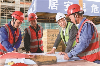 | 浙江省建工集团木工班班长程泰德(右二)在浙江大学校友总部经济园(二期)项目参与研讨施工方案。 |