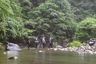 昨日,台州市黄岩区宁溪派出所大寺基生态警务站民警和生态保护志愿者一起,在大寺基林场的深山中巡逻。近年来,台州市公安局黄岩分局积极推进“生态警务”,保持对破坏生态环境违法犯罪“零容忍”,切实守护绿水青山。