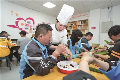 | “金平湖工匠”吴妹华(中)在嘉兴平湖银泰百货职工服务驿站当一天站长,给小哥们集体过端午。 |