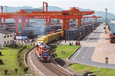 昨日,金华市金东区华东国际联运港,全国首趟“金华—巴希—巴库”跨里海国际运输走廊中欧班列从铁路金华南站鸣笛启程。